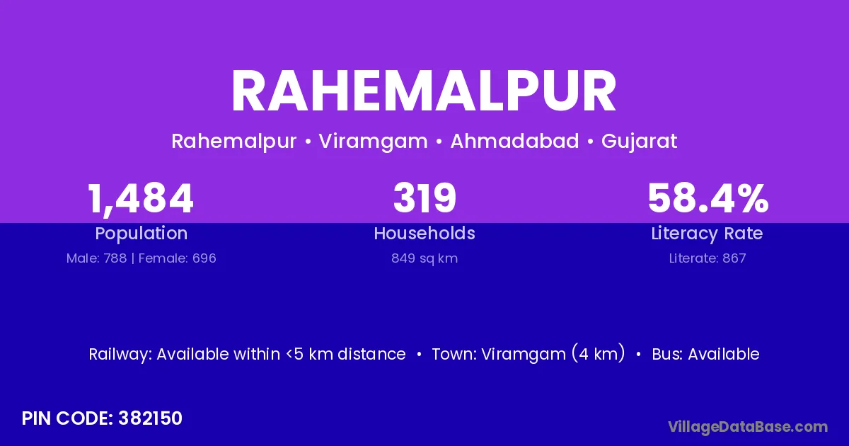 Viramgam (4 km) is the nearest town to Rahemalpur village for major economic activities and is located approximately 4 km away.