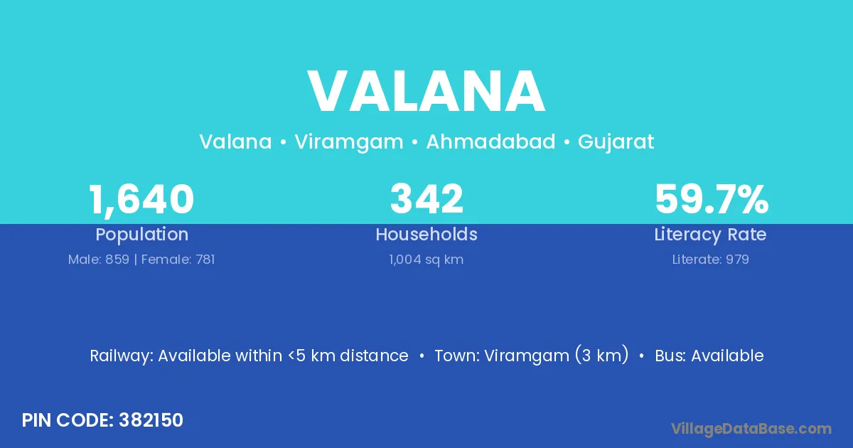 Viramgam (3 km) is the nearest town to Valana village for major economic activities and is located approximately 3 km away.