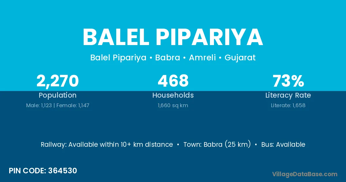 Babra (25 km) is the nearest town to Balel Pipariya village for major economic activities and is located approximately 25 km away.