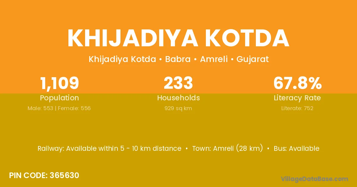 Khijadiya Kotda village has a total population of 1,109 people, of which 553 are males and 556 are females.