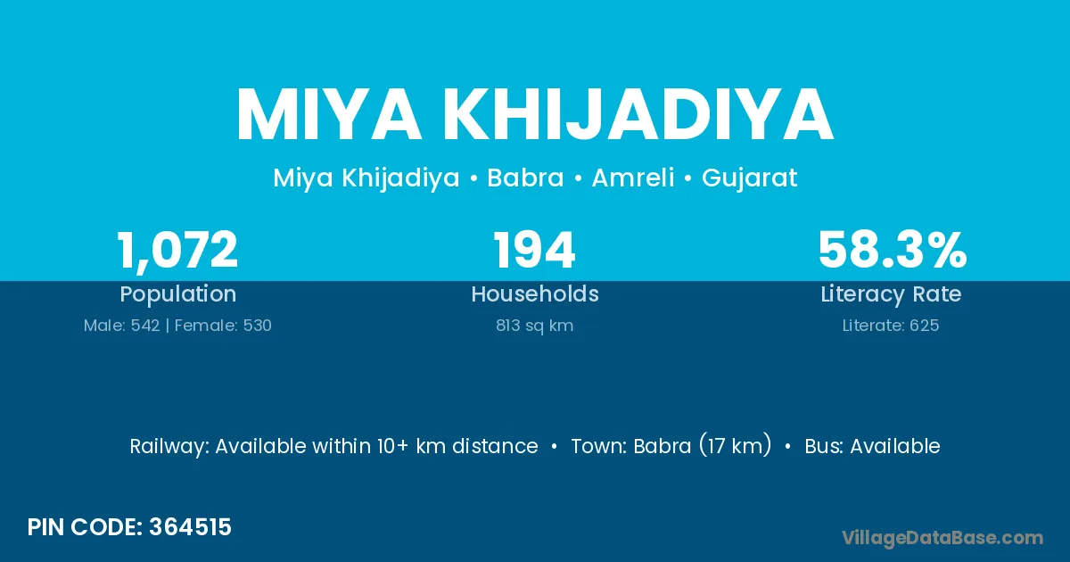 Babra (17 km) is the nearest town to Miya Khijadiya village for major economic activities and is located approximately 17 km away.