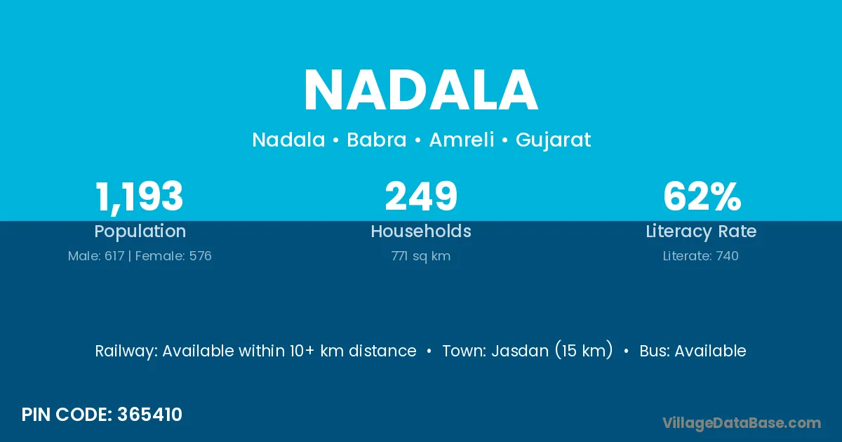 Jasdan (15 km) is the nearest town to Nadala village for major economic activities and is located approximately 15 km away.