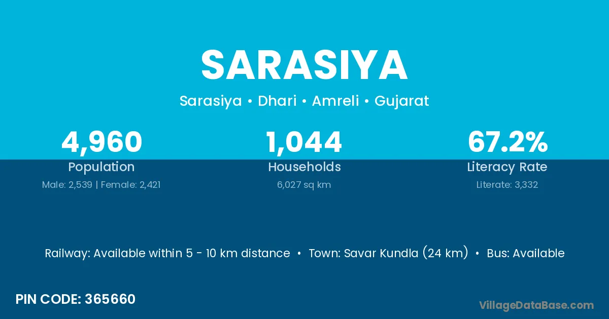 Savar Kundla (24 km) is the nearest town to Sarasiya village for major economic activities and is located approximately 24 km away.