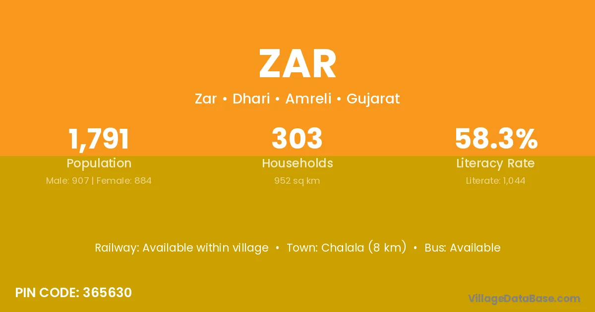 Zar village has a total population of 1,791 people, of which 907 are males and 884 are females.