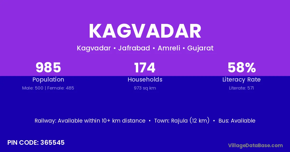 Rajula (12 km) is the nearest town to Kagvadar village for major economic activities and is located approximately 12 km away.