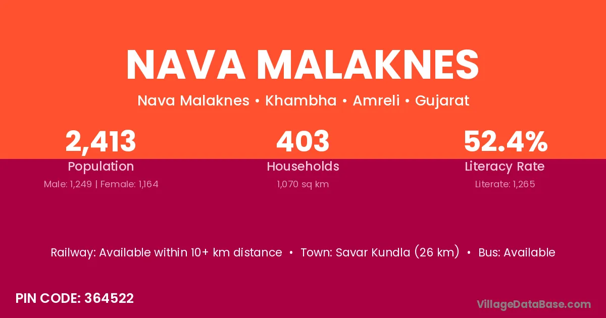 Savar Kundla (26 km) is the nearest town to Nava Malaknes village for major economic activities and is located approximately 26 km away.
