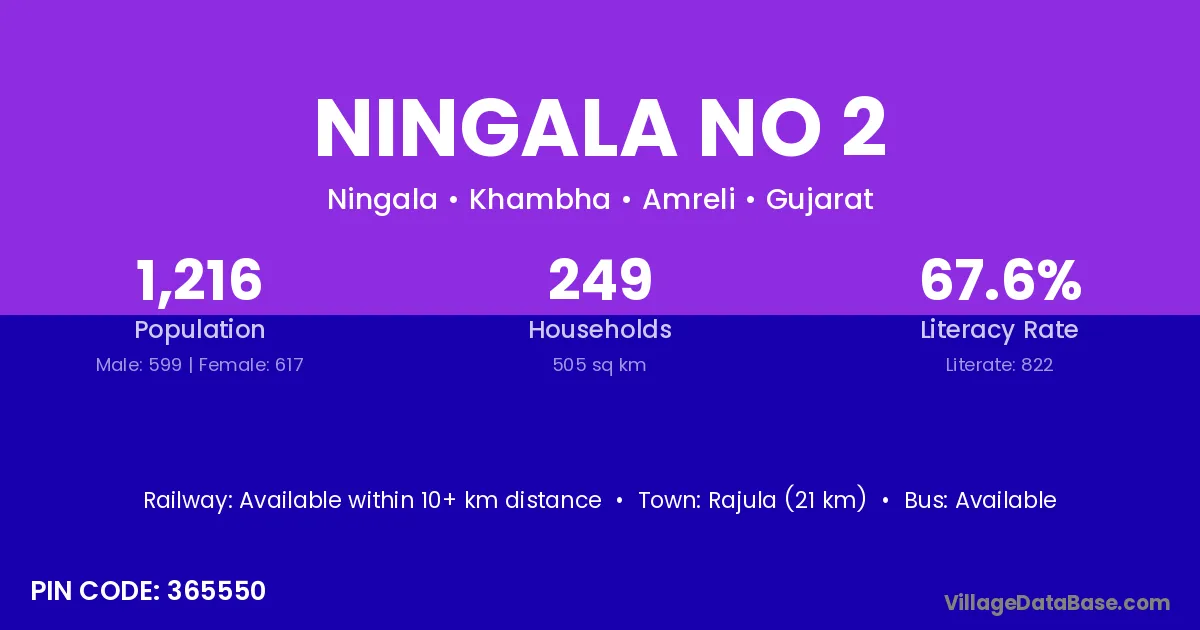 Rajula (21 km) is the nearest town to Ningala No 2 village for major economic activities and is located approximately 21 km away.