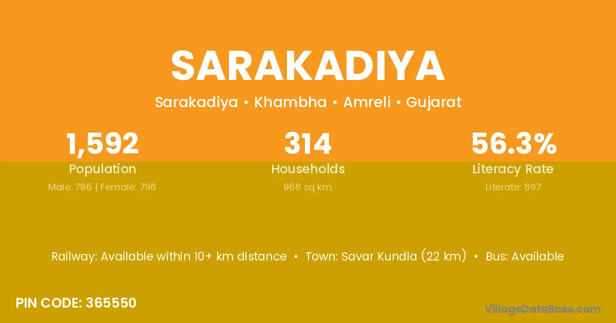 Sarakadiya village has a total population of 1,592 people, of which 796 are males and 796 are females.