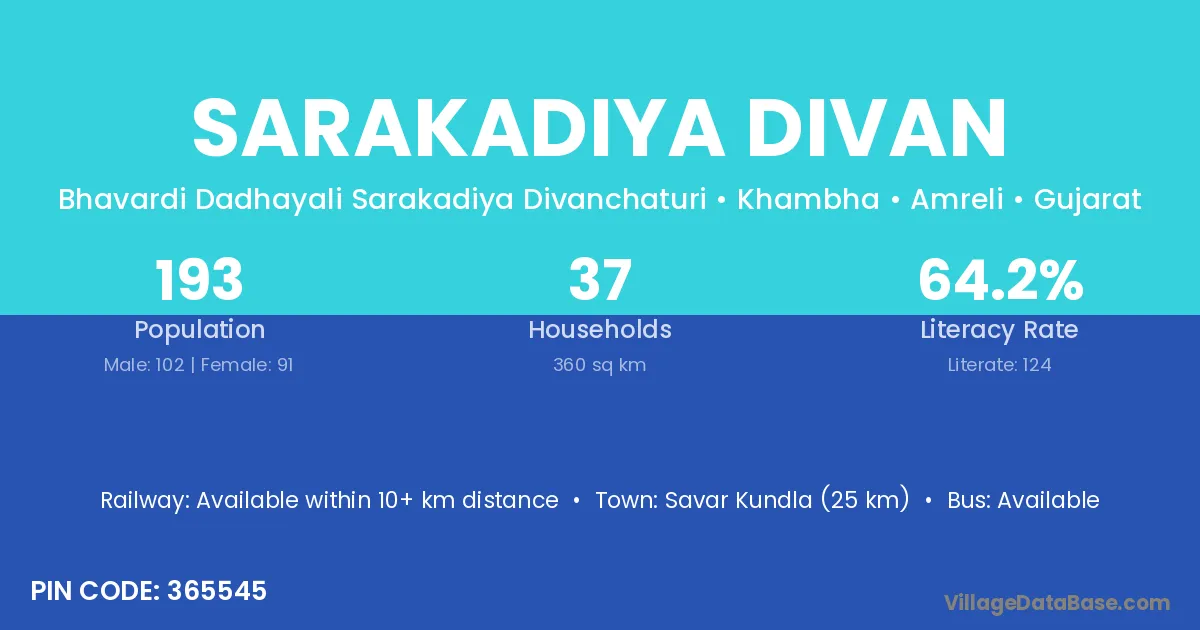 Savar Kundla (25 km) is the nearest town to Sarakadiya Divan village for major economic activities and is located approximately 25 km away.