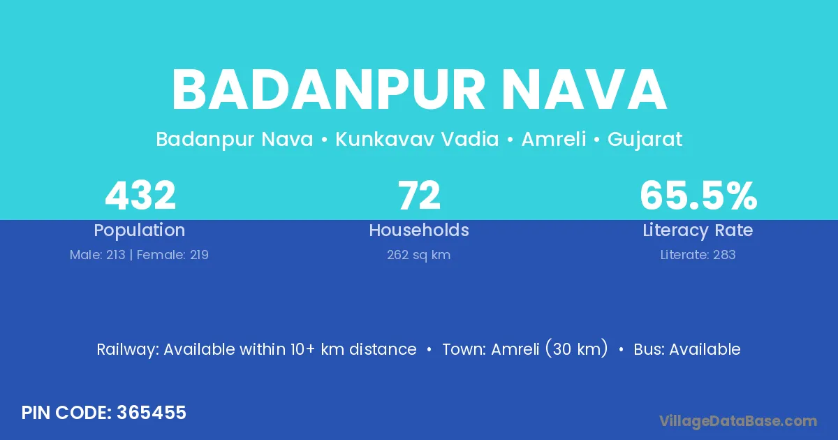 Amreli (30 km) is the nearest town to Badanpur Nava village for major economic activities and is located approximately 30 km away.