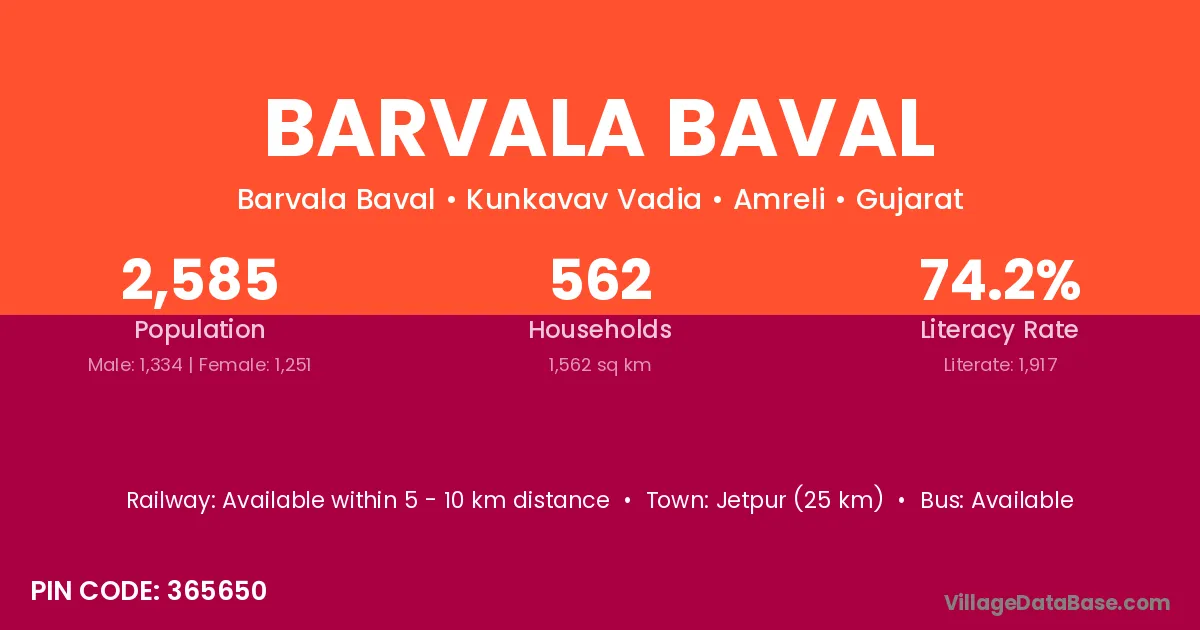 Jetpur (25 km) is the nearest town to Barvala Baval village for major economic activities and is located approximately 25 km away.