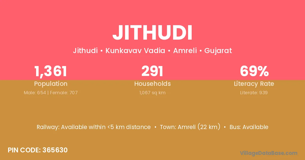 Amreli (22 km) is the nearest town to Jithudi village for major economic activities and is located approximately 22 km away.
