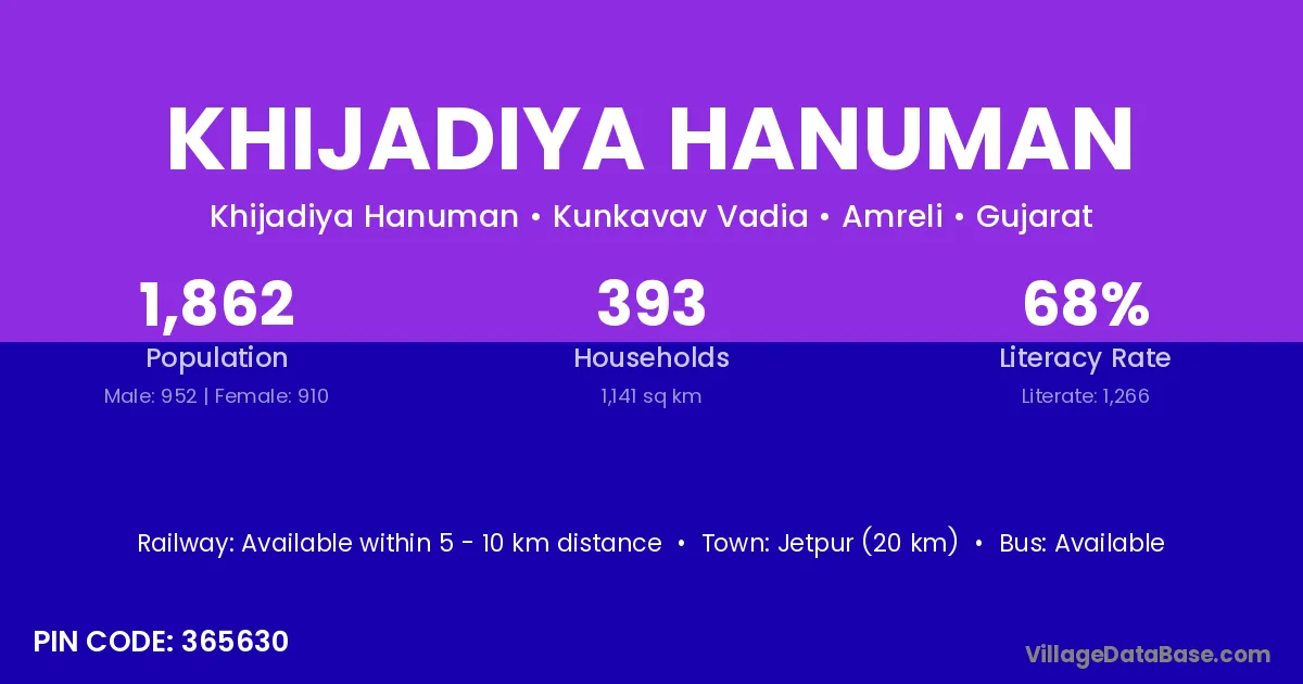 Khijadiya Hanuman village has a total population of 1,862 people, of which 952 are males and 910 are females.