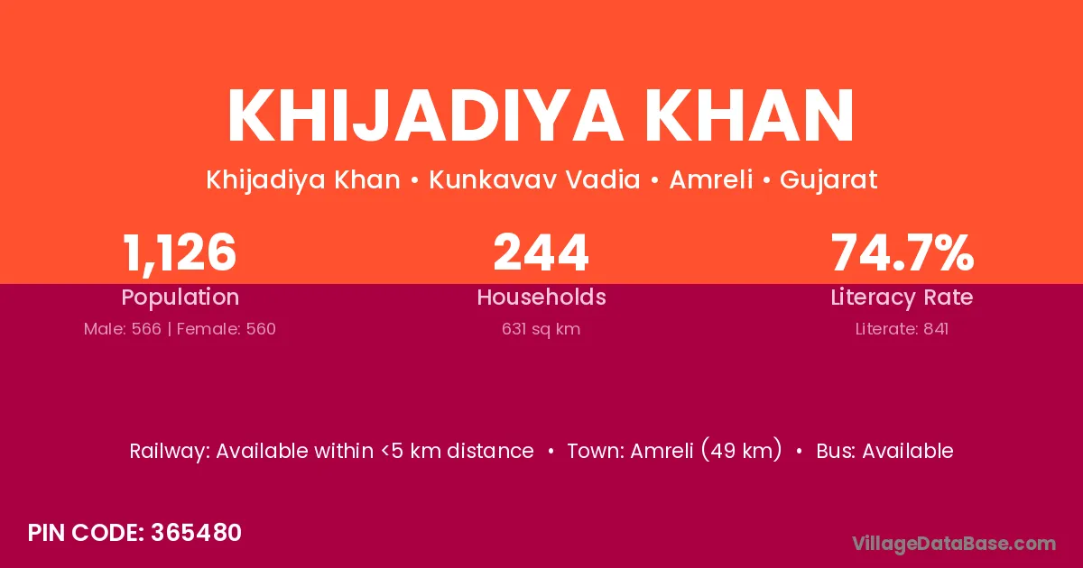 Khijadiya Khan village has a total population of 1,126 people, of which 566 are males and 560 are females.