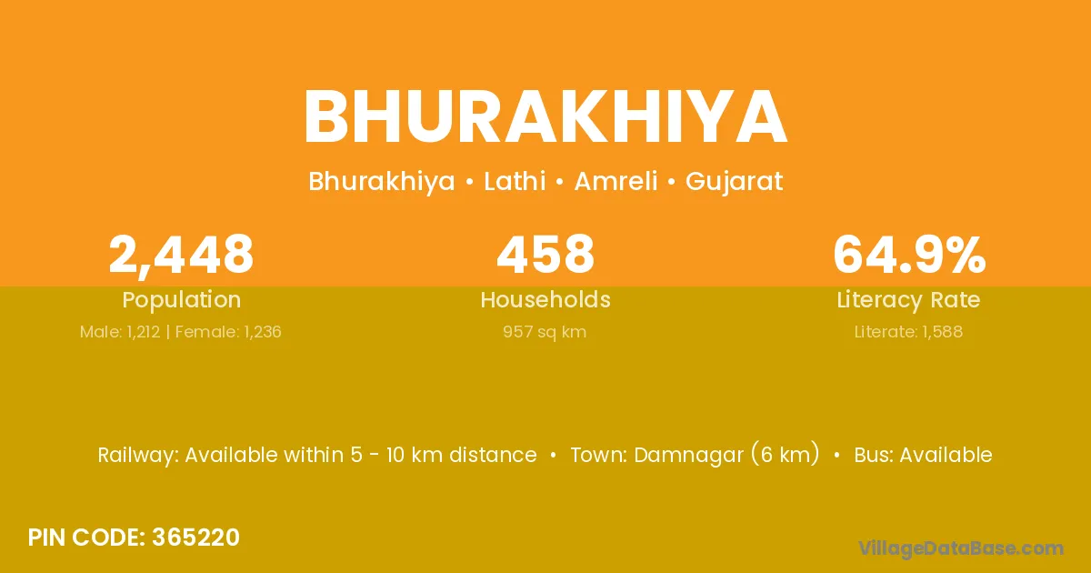 Damnagar (6 km) is the nearest town to Bhurakhiya village for major economic activities and is located approximately 6 km away.
