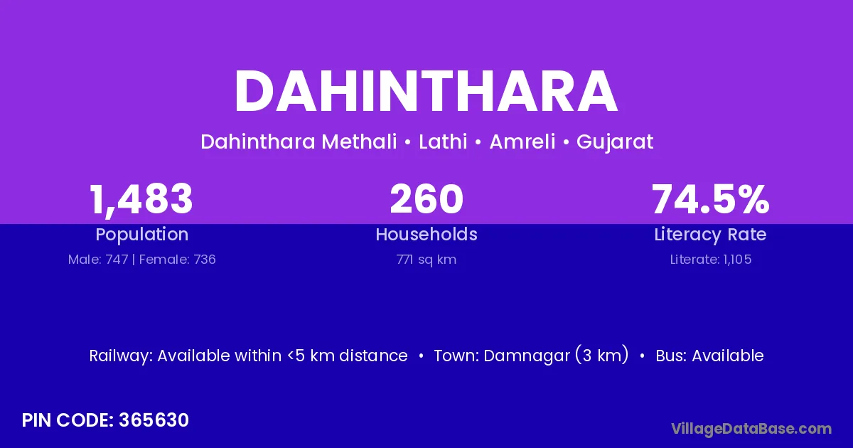 Dahinthara village is located in the Lathi Taluka of the Amreli district in Gujarat .