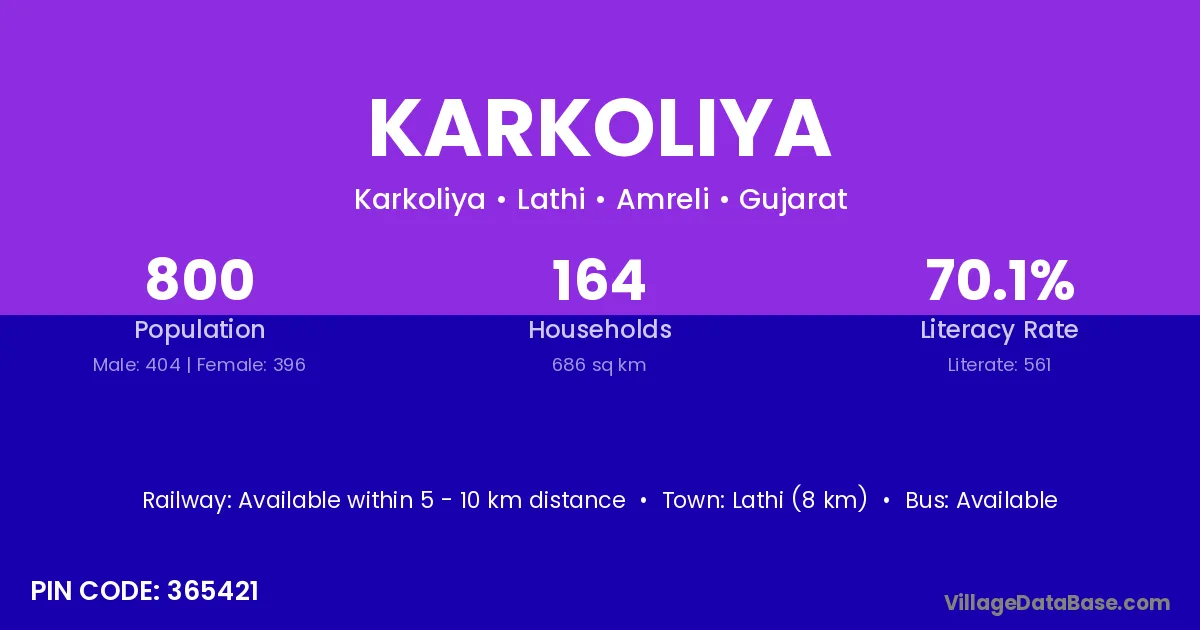 Lathi (8 km) is the nearest town to Karkoliya village for major economic activities and is located approximately 8 km away.