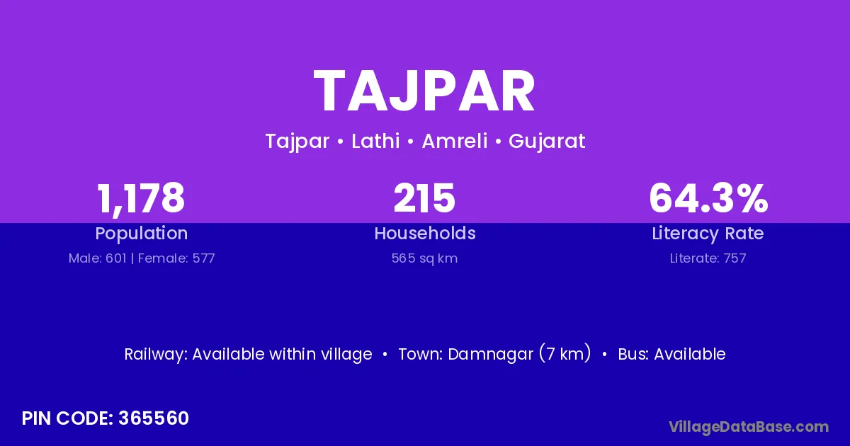 Damnagar (7 km) is the nearest town to Tajpar village for major economic activities and is located approximately 7 km away.