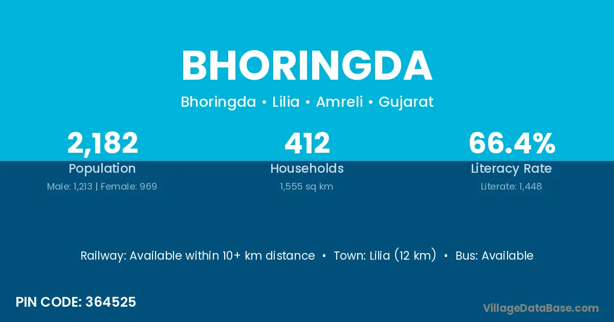 Lilia (12 km) is the nearest town to Bhoringda village for major economic activities and is located approximately 12 km away.