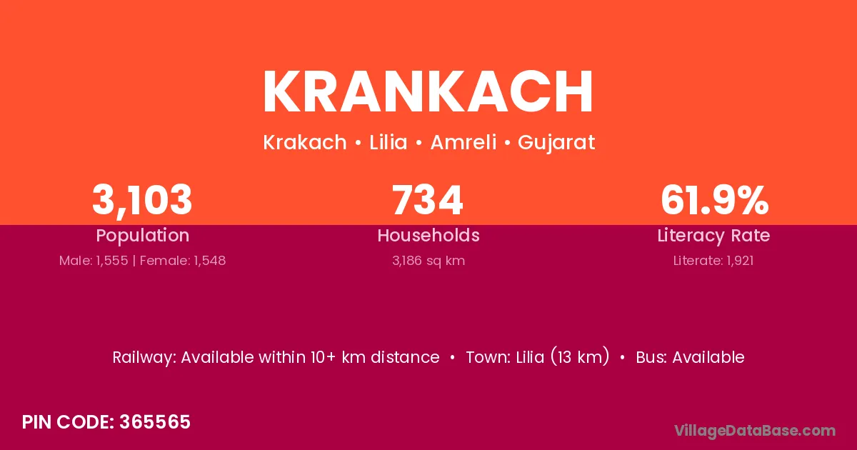 Krankach village has a total population of 3,103 people, of which 1,555 are males and 1,548 are females.