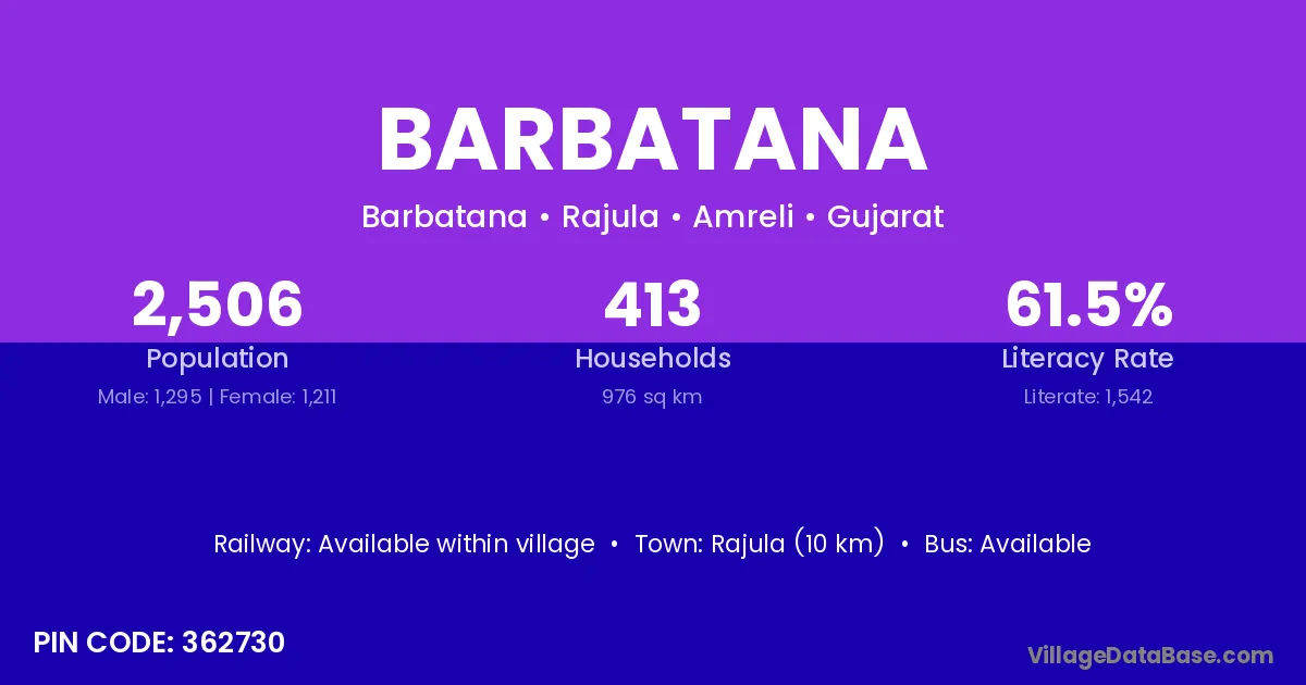 Rajula (10 km) is the nearest town to Barbatana village for major economic activities and is located approximately 10 km away.