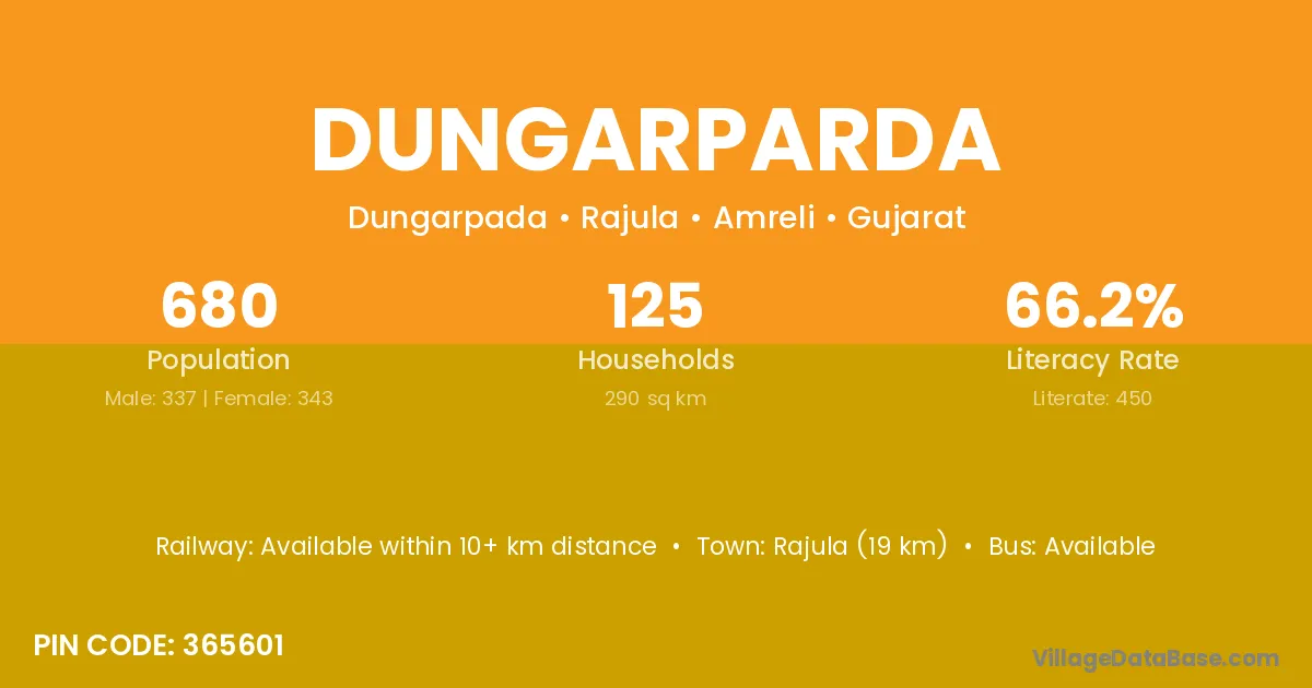 Rajula (19 km) is the nearest town to Dungarparda village for major economic activities and is located approximately 19 km away.