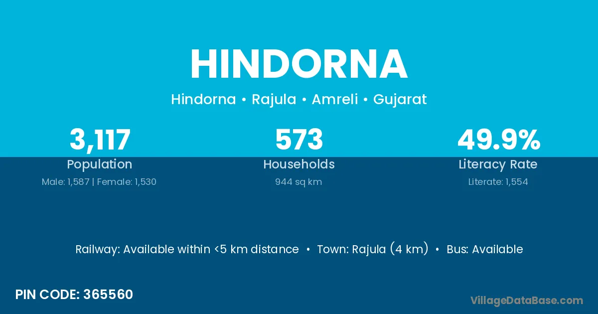 Rajula (4 km) is the nearest town to Hindorna village for major economic activities and is located approximately 4 km away.