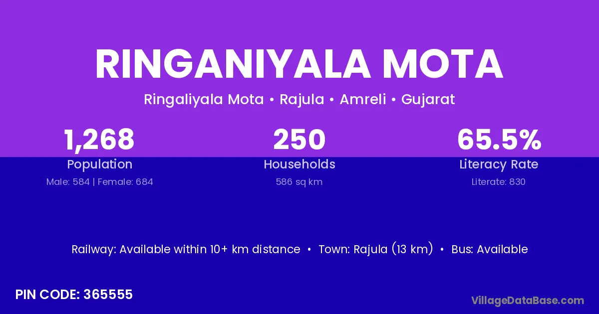Rajula (13 km) is the nearest town to Ringaniyala Mota village for major economic activities and is located approximately 13 km away.