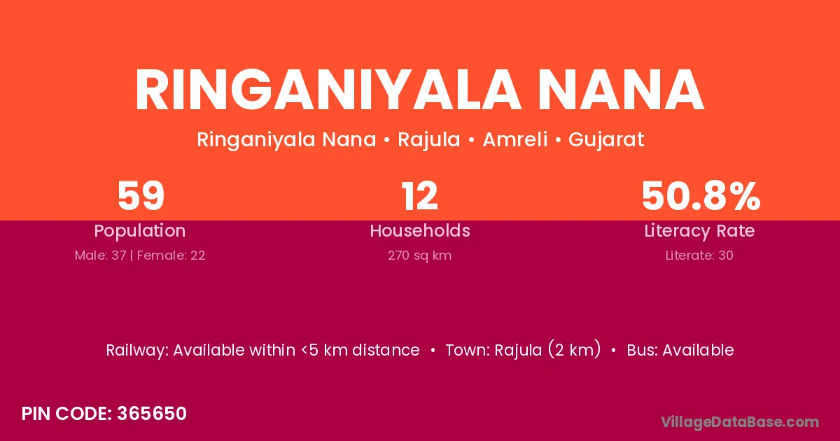 Rajula (2 km) is the nearest town to Ringaniyala Nana village for major economic activities and is located approximately 2 km away.