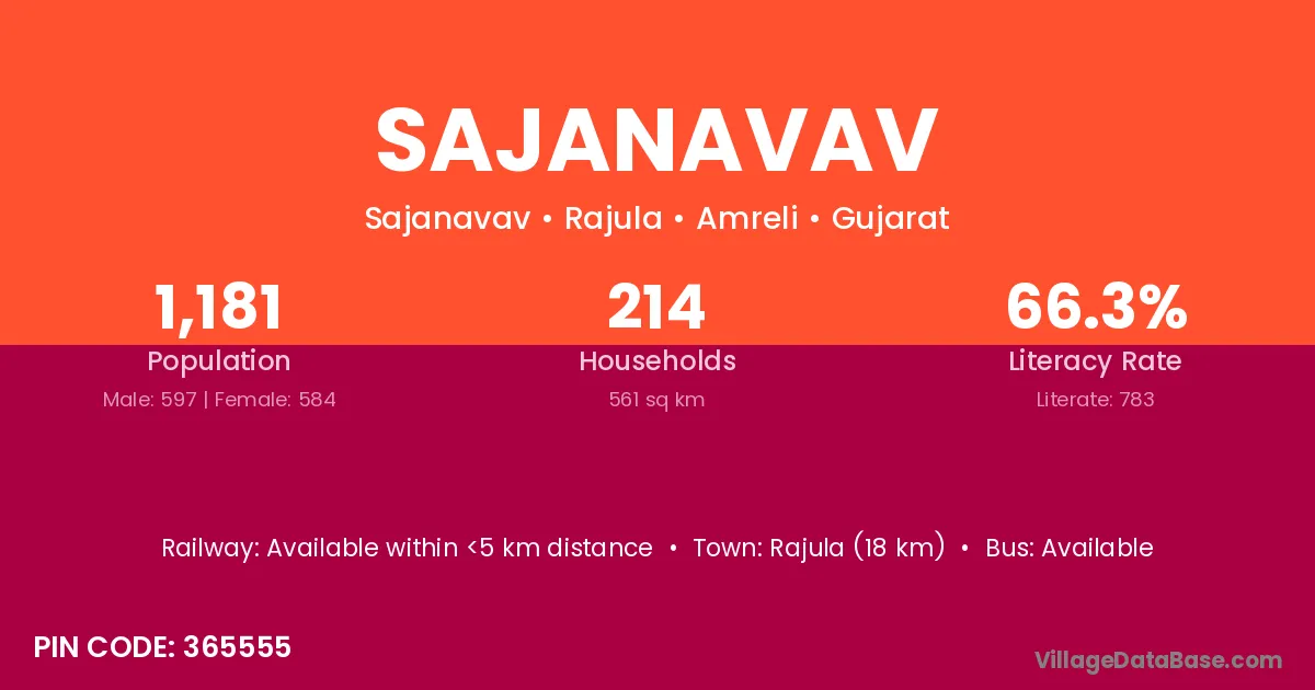 Rajula (18 km) is the nearest town to Sajanavav village for major economic activities and is located approximately 18 km away.