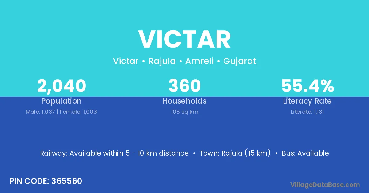 Rajula (15 km) is the nearest town to Victar village for major economic activities and is located approximately 15 km away.