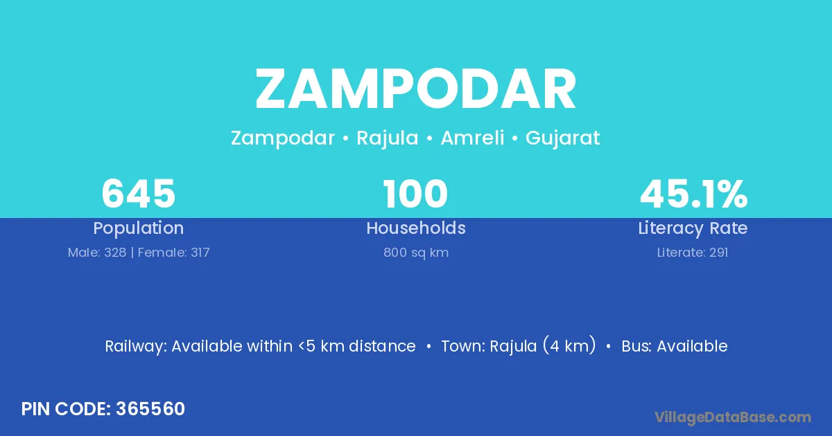 Rajula (4 km) is the nearest town to Zampodar village for major economic activities and is located approximately 4 km away.