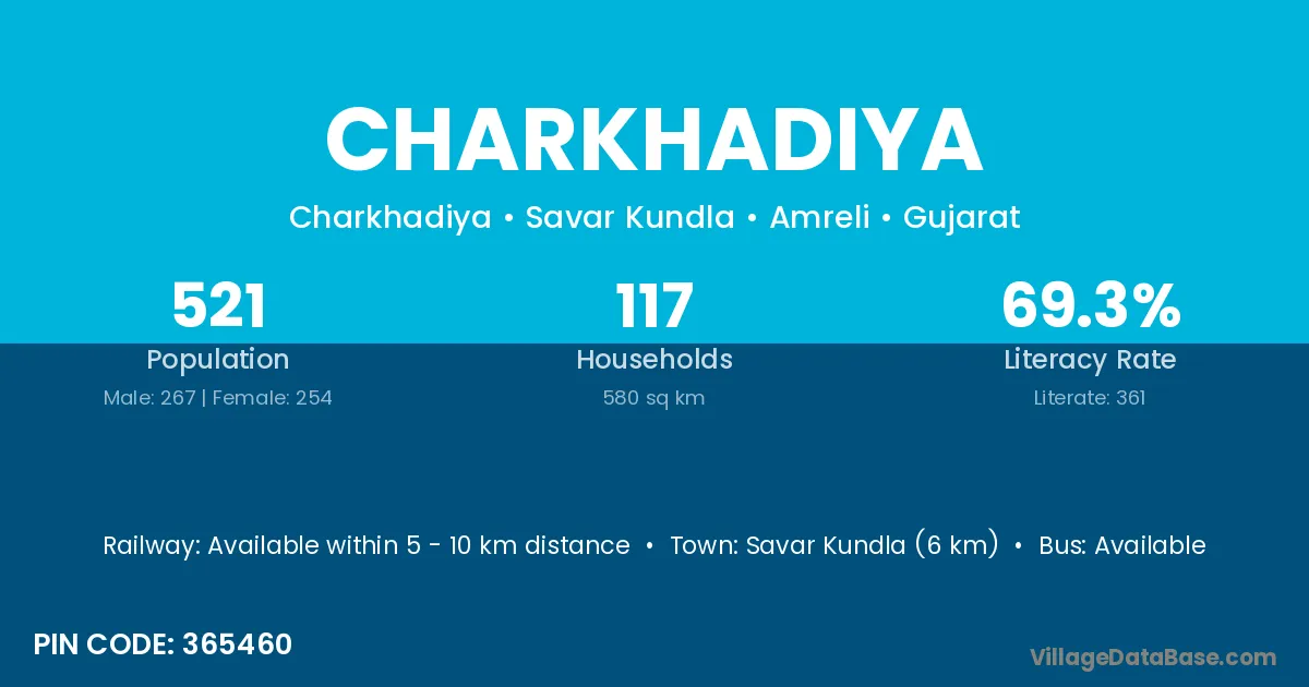 Savar Kundla (6 km) is the nearest town to Charkhadiya village for major economic activities and is located approximately 6 km away.