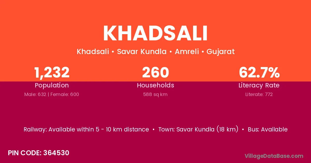 Savar Kundla (18 km) is the nearest town to Khadsali village for major economic activities and is located approximately 18 km away.