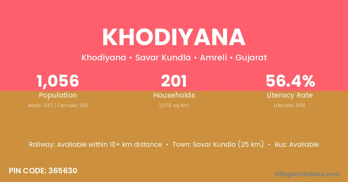 Savar Kundla (25 km) is the nearest town to Khodiyana village for major economic activities and is located approximately 25 km away.