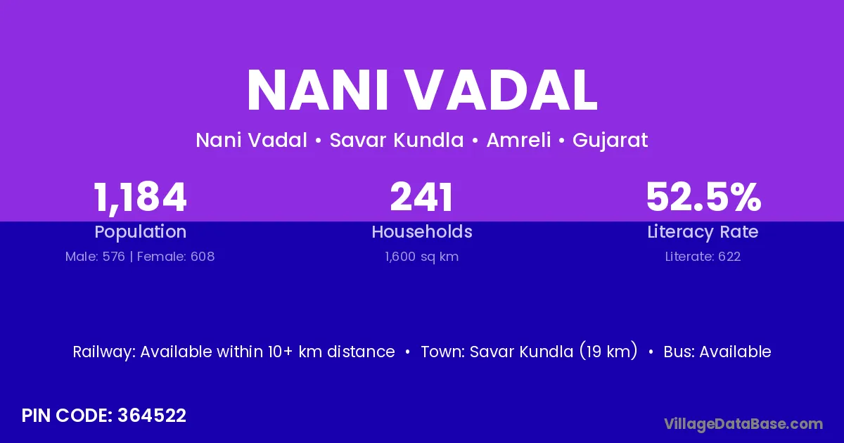 Savar Kundla (19 km) is the nearest town to Nani Vadal village for major economic activities and is located approximately 19 km away.