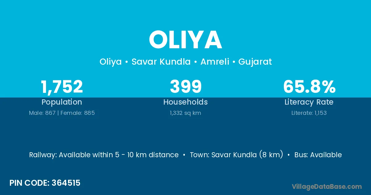 Savar Kundla (8 km) is the nearest town to Oliya village for major economic activities and is located approximately 8 km away.