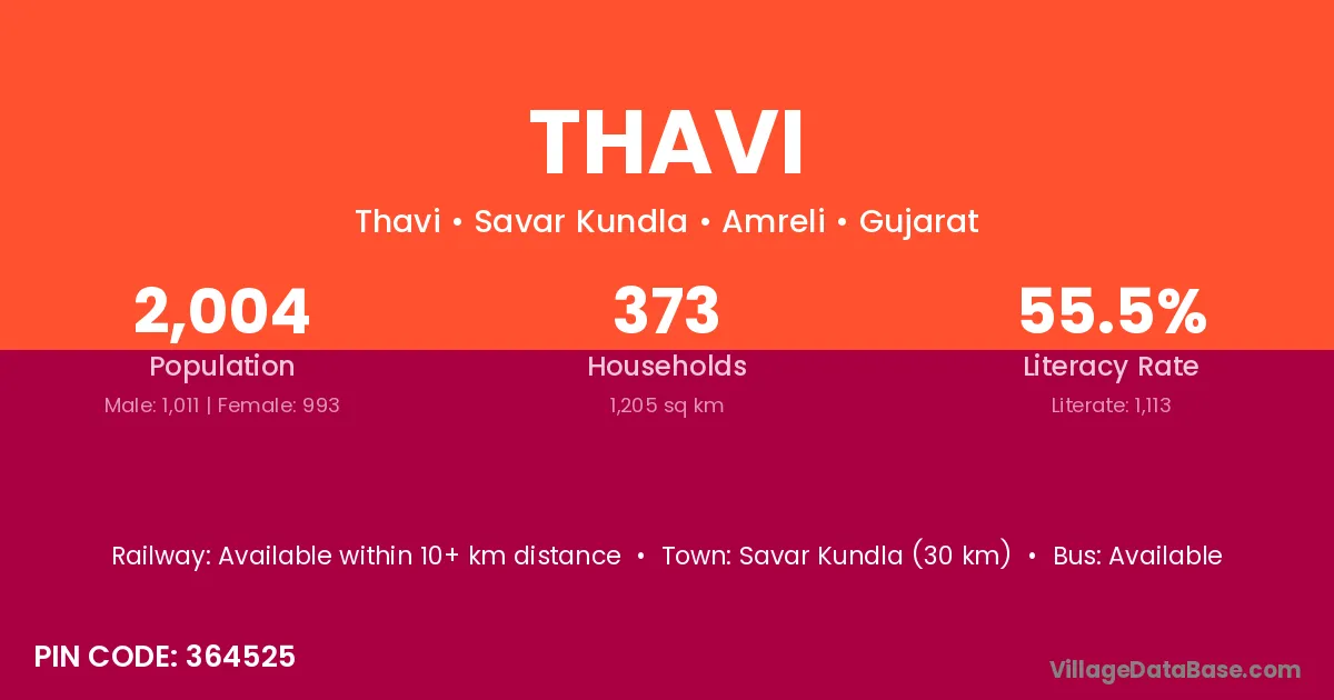 Savar Kundla (30 km) is the nearest town to Thavi village for major economic activities and is located approximately 30 km away.