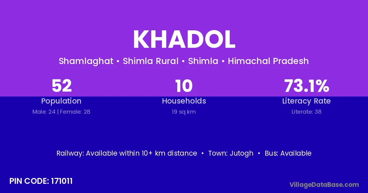 The literacy rate of Khadol village is 69.84%. Male literacy stands at 78.23% and female literacy at 60.66%.