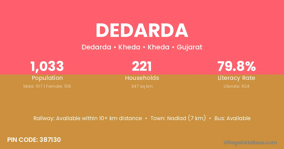 Borsad (5 km) is the nearest town to Dedarda village for major economic activities and is located approximately 5 km away.