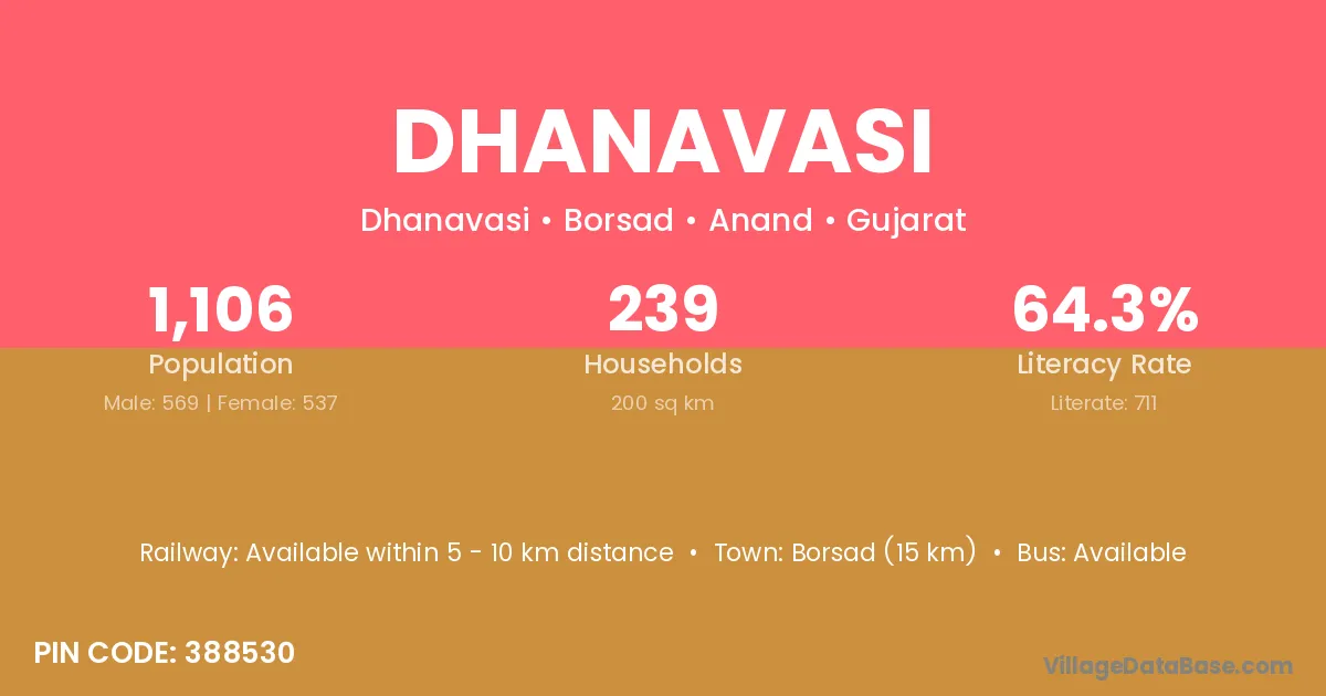 Borsad (15 km) is the nearest town to Dhanavasi village for major economic activities and is located approximately 15 km away.
