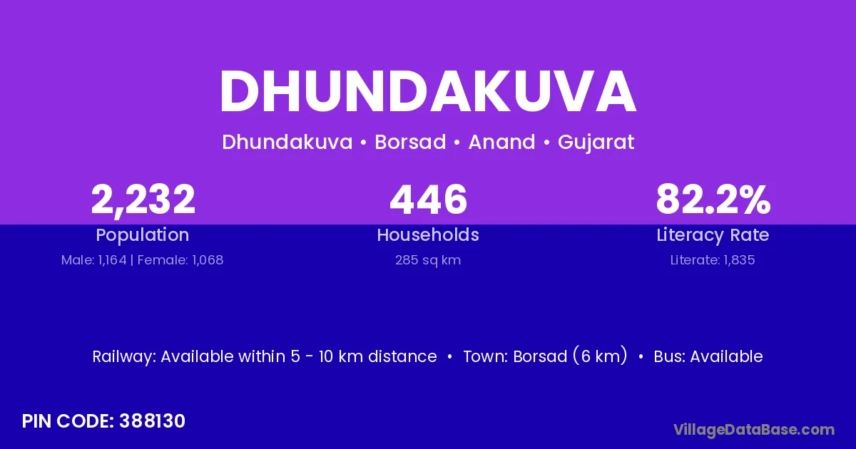 Borsad (6 km) is the nearest town to Dhundakuva village for major economic activities and is located approximately 6 km away.