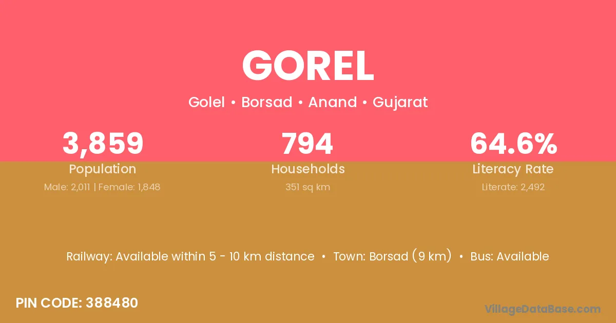 Borsad (9 km) is the nearest town to Gorel village for major economic activities and is located approximately 9 km away.