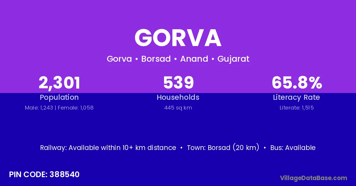Borsad (20 km) is the nearest town to Gorva village for major economic activities and is located approximately 20 km away.
