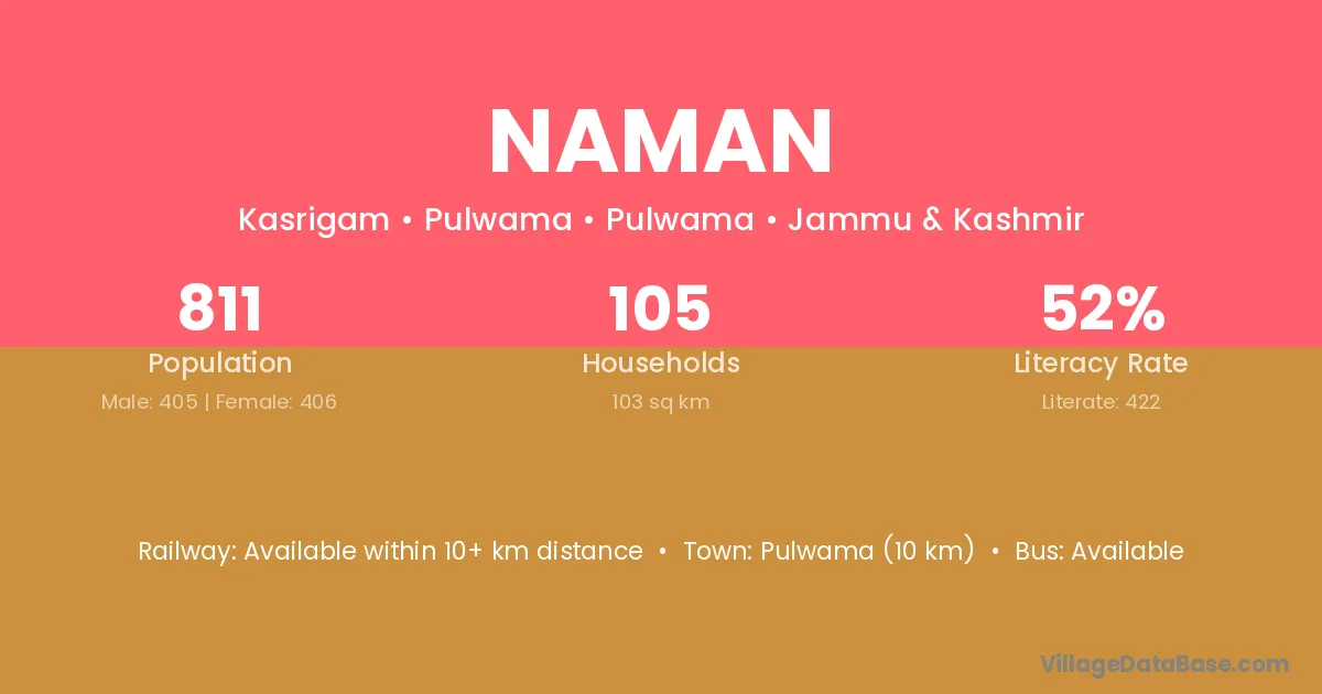 The literacy rate of Naman village is 78.93%. Male literacy stands at 82.28% and female literacy at 75.30%.