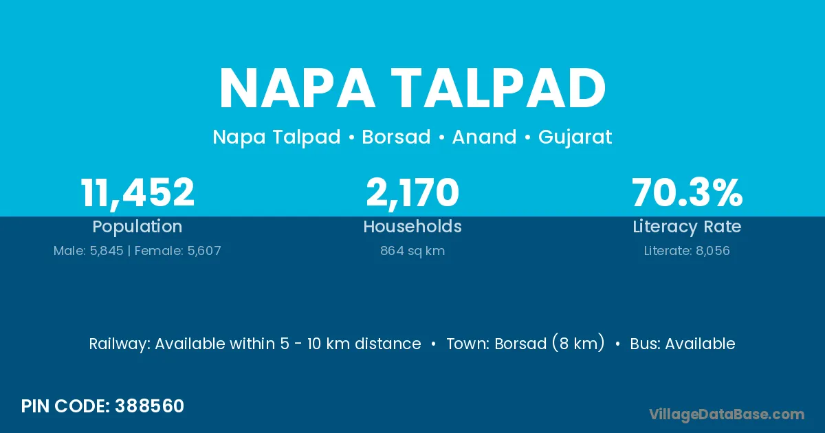 Borsad (8 km) is the nearest town to Napa Talpad village for major economic activities and is located approximately 8 km away.