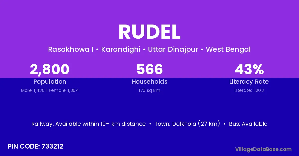 The literacy rate of Rudel village is 75.53%. Male literacy stands at 80.80% and female literacy at 69.74%.