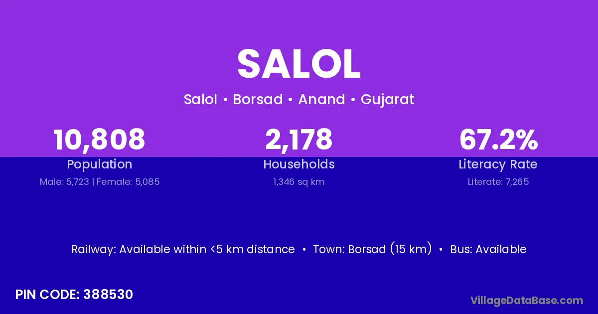 Borsad (15 km) is the nearest town to Salol village for major economic activities and is located approximately 15 km away.