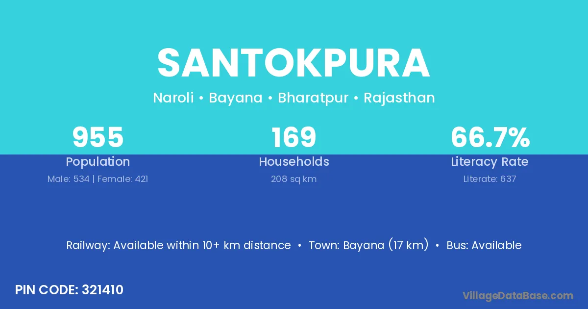 Santokpura village has a total population of 2,007 people, of which 1,006 are males and 1,001 are females.