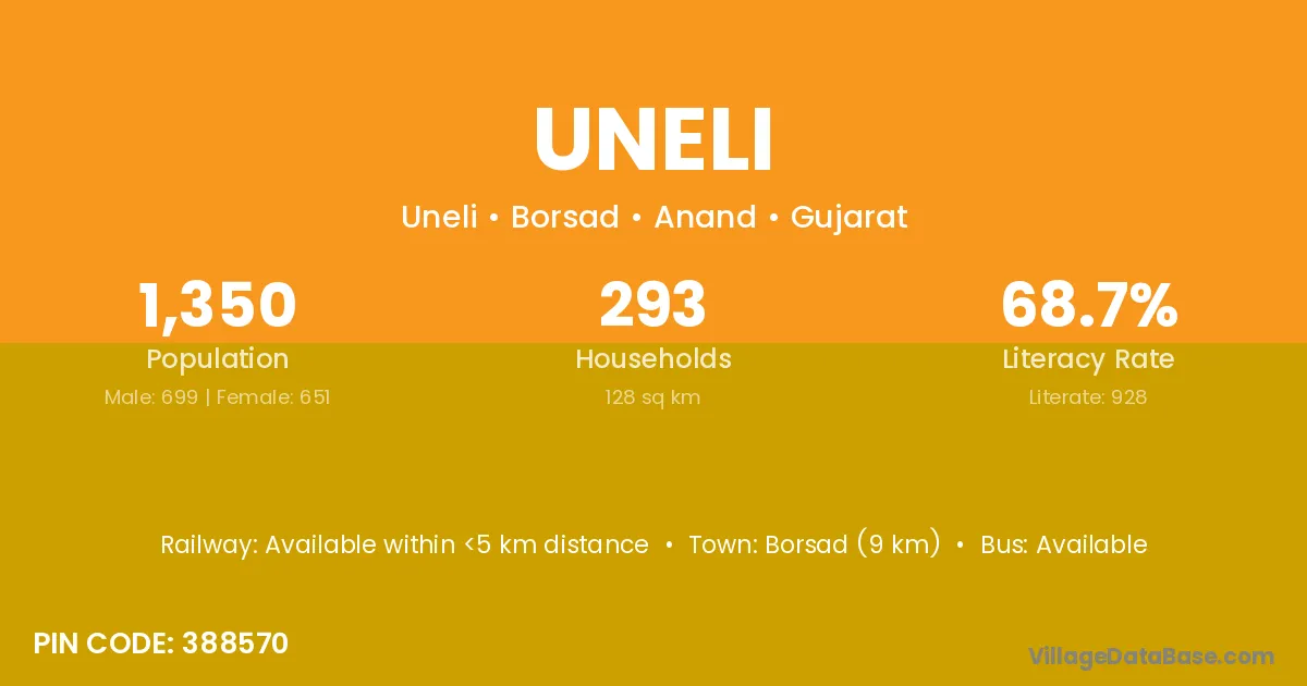 Borsad (9 km) is the nearest town to Uneli village for major economic activities and is located approximately 9 km away.